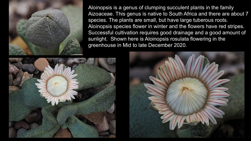 Aloinopsis is a genus of clumping succulent plants in the family Aizoaceae. This genus is native to South Africa and there are about 7 species. The plants are small, but have large tuberous roots. Aloinopsis species flower in winter and the flowers have red stripes. Successful cultivation requires good drainage and a good amount of sunlight.